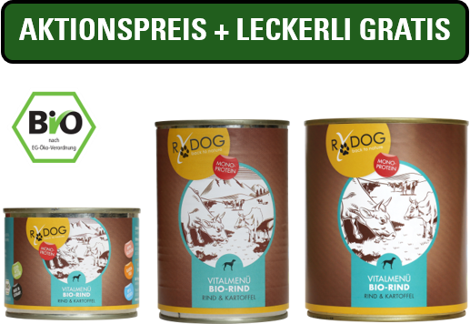 - Aktion Bio-Rind 400g: 12 Dosen Bio-Rind 400g + 1 Packung 180g Pferdeherzen + 1 Packung 180g Ziegen-Mix
